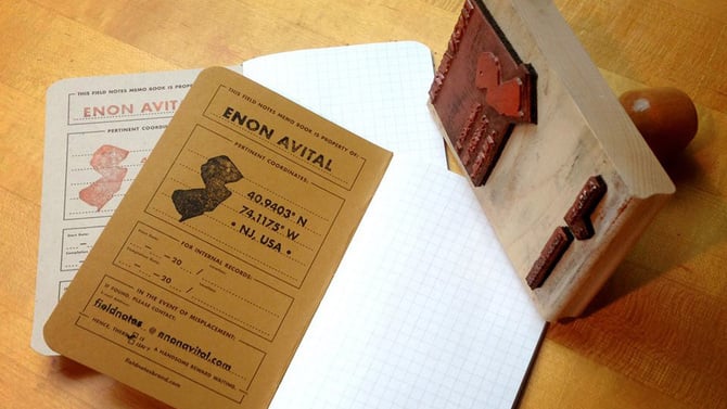 I happen to be of the first type, generally recording my name, literal coordinates of my hometown, a small illustration of New Jersey with a dot representing my approximate location, and my email address. What's always bothered me is the fact that I always scribble the information in haste, resulting in a less-than-desireable look for my otherwise good-looking Field Notes. The discussion on Facebook got me thinking about how I could get the ideal result every time, and so, my stamp was born.